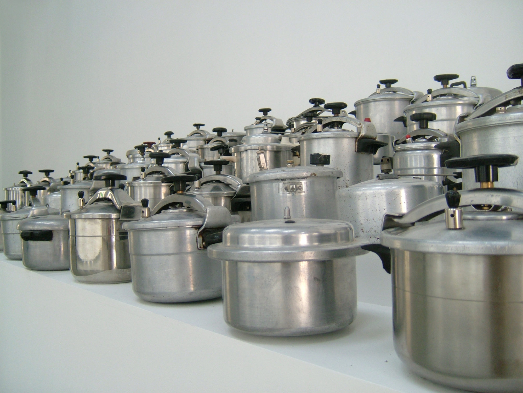 For her solo show in the gallery, Pilar Albarracín is occupying the Project Room with an army of (about fifty) pressure-cookers, where steam is synchronized to the rhythm of the ‘Internationale’. With this vibrant singsong, these «Marmites enragées» (enraged cooking pots) express their outrage over the role that society has cruelly assigned to them.”