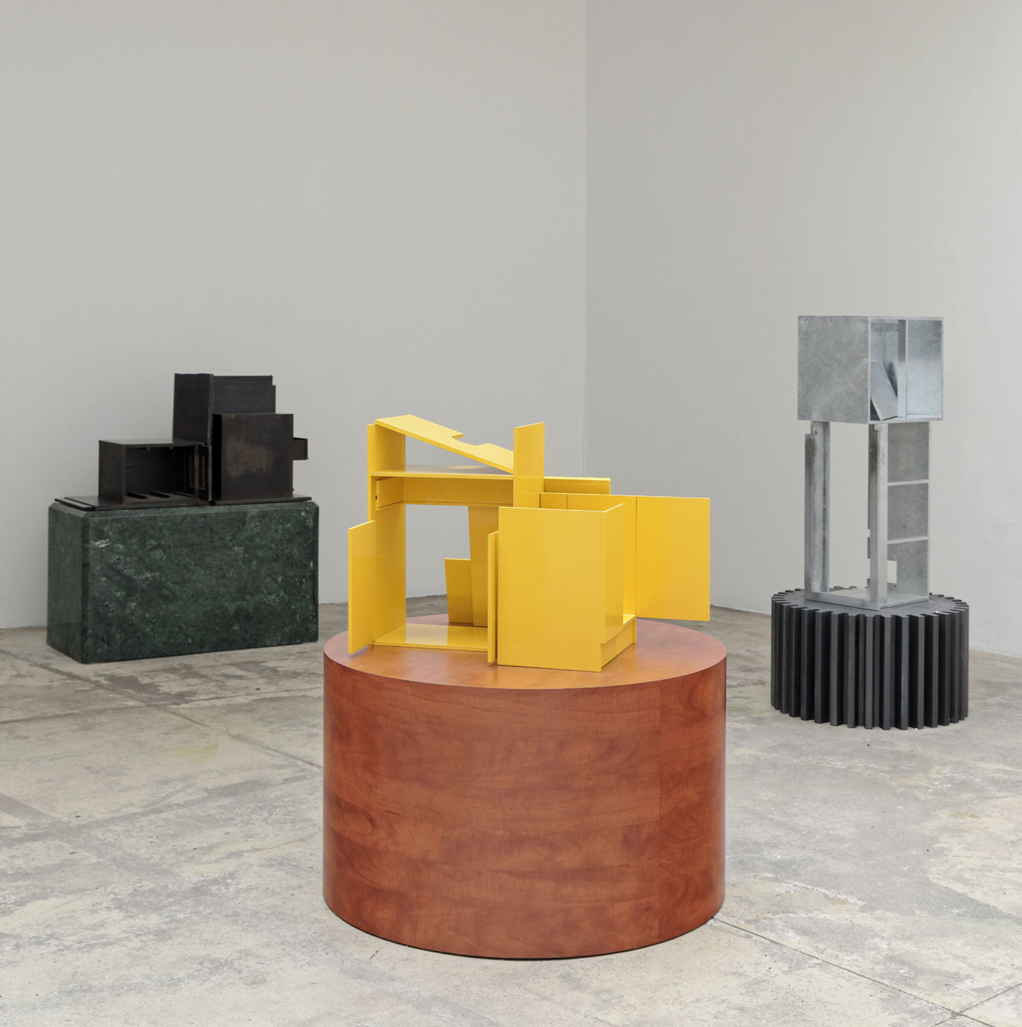 An important body of sculptures is being deployed at Galerie Georges-Philippe & Nathalie Vallois by Julien Berthier under the generic title: Portraits. The whole offers a large range of abstract forms moulded in materials making up an almost exhaustive history of the Ronde-bosse, from Antiquity to the Modern Age. Such a demonstration of creative force will awaken only thin suspicions towards the artist who, in this very same space, presented a patent work for a conceptual art of rapture – in the criminal sense of the word – (A LOST, 2011), for all great artists distinguish themselves by their great deviations. Nevertheless, perplexity will replace surprise when, after measuring the paradox of presenting “interior” works in an exhibition entitled Public Sculptures, we will attempt to bring together each work and its title. A little too baroque and showing too nice a craftsmanship for honest pretenders to minimalism, these geometric abstractions are already perverted by signifiers which escort them, and not the least: Jean Jaurès, Hannah Arendt, Raymond Radiguet. Statuary having had none other noble mission than representing the greats of this world, which allegoric operation will allow us to recognise the author of The Devil in the Flesh in this yellow equilibrist construction made of painted steel, resting on its cylindrical red plywood base? Is the reference to be found in the farce Le Gendarme incompris, or is the argument of the “inspiration of the artist” self-sufficient?