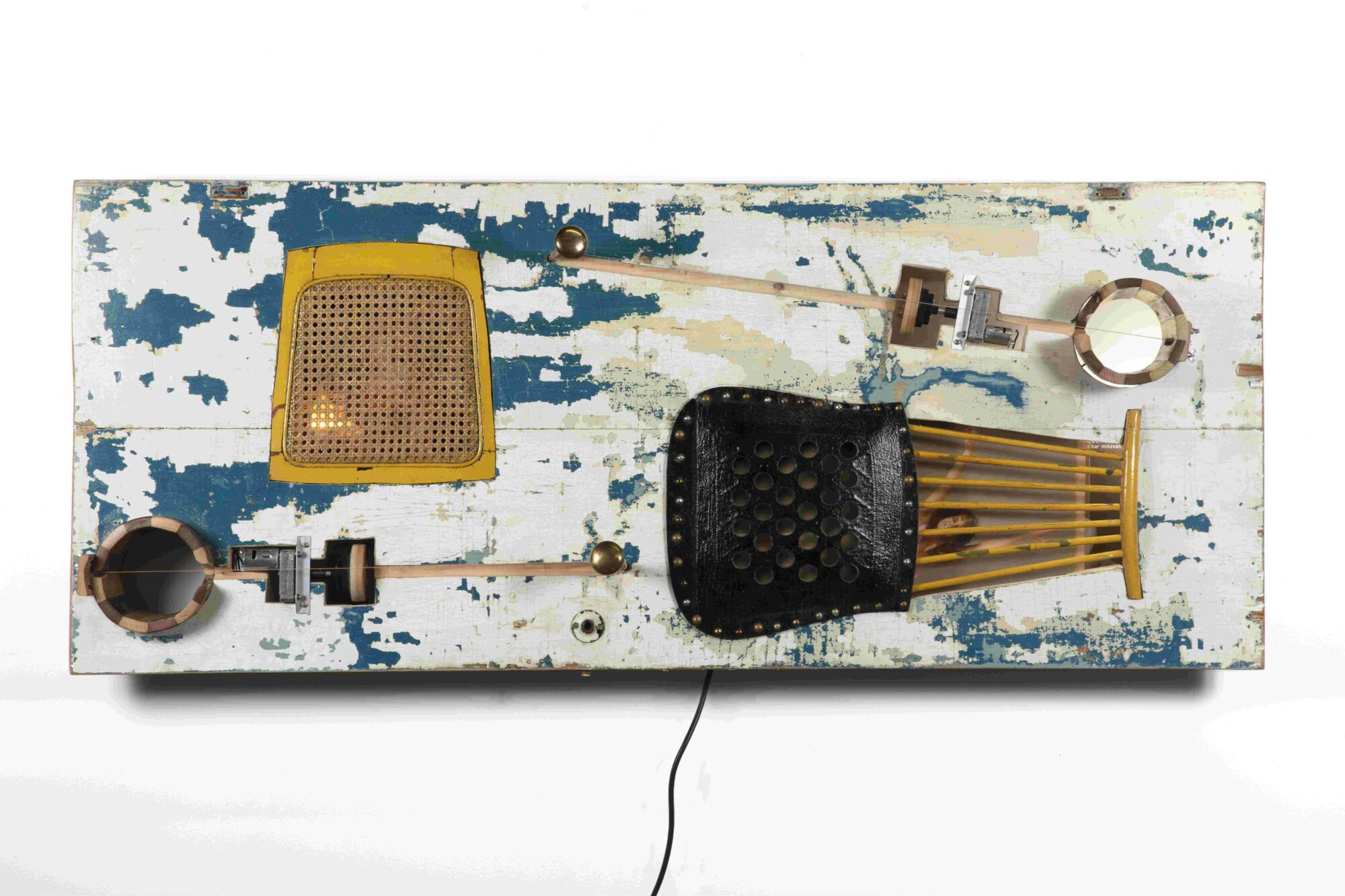 LP covers, wood, motors, guitar strings, motors, cord, electrical lights