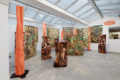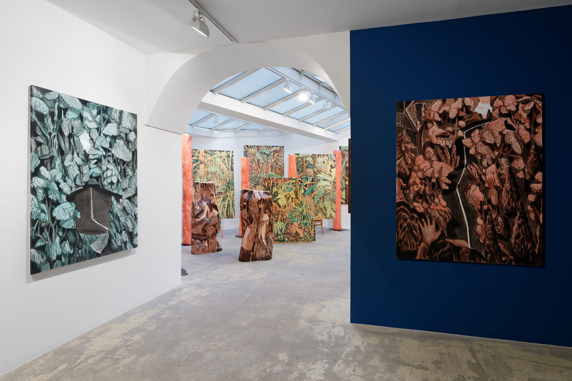 Les espaces de la galerie sont ensuite pensés comme un décor quasi théâtral, dans lequel un ensemble de panneaux – individuels ou conçus en polyptyques – représentent une forêt dense aux couleurs chaudes et aux traits marqués. Les sculptures qui les accompagnent prennent la forme de troncs d’arbres coupés aux aspects totémiques et servent de lieu de vie à ses personnages et saynètes énigmatiques. Les grandes toiles qui les entourent, réalisées à l’acrylique ,dévoilent une nature sans perspective ni transparence, une succession de plans sans point de fuite. La forêt est ici utilisée comme un outil afin d’explorer d’infinies possibilités de motifs et textures. Par la superposition d’aplats et la répétition des traits, Seinturier revient à ses années passées à l’ENSAD (Arts Décoratifs) consacrées à l’apprentissage de diverses techniques d’impression. La superposition des couches, traitée comme une succession d’impressions, permet à l’artiste de retrouver le motif originel par des approches différentes et d’atteindre le lâcher-prise du geste.