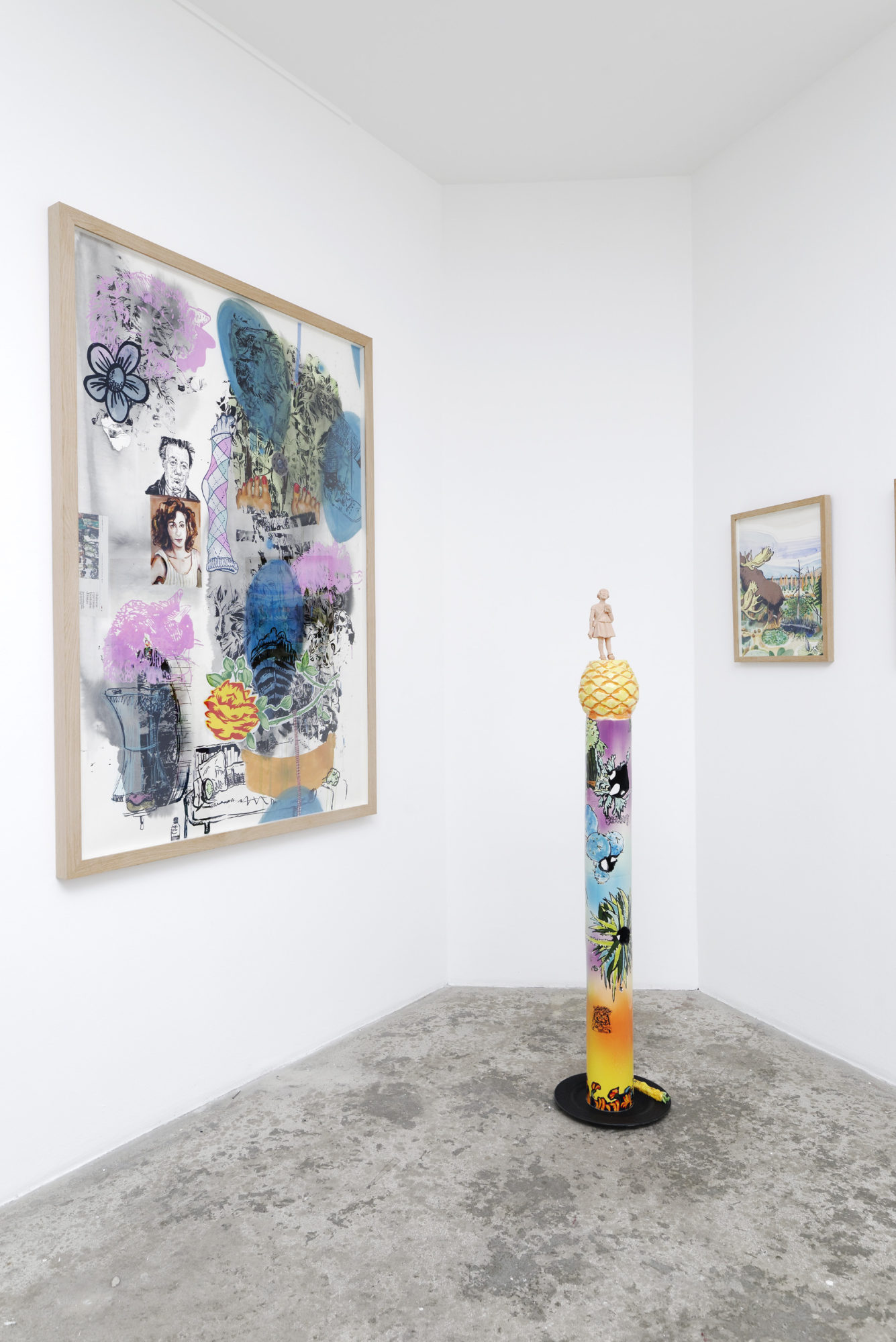 À l’été 2015, une résidence au Mexique donne ainsi lieu à une série de sculptures en céramique (« Pop columns »), agrégats d’objets (caisse, cornet de glace, amphore, pomme, figurine…) et de motifs peints plus ou moins exotiques et inédits (cactus, fleurs, chiens…) sans rapports apparents – sauf ceux que les artistes révèlent d’une pièce à l’autre, au fil des oeuvres, dans une sorte d’homologie plastique, qui peut ou non échapper au regardeur. Le principal étant que ça « tienne » bel et bien. Chez Lamarche-Ovize, les figures, les images et les références se superposent et circulent pêle-mêle et sans complexe, sautant d’un médium au suivant, du papier à la céramique. Adeptes de l’accumulation et de la citation (voir les vases « Barbodoigts » et les collages « To Sarah »), les deux artistes le sont aussi de la concaténation et du sampling.